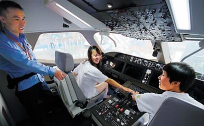 鄉(xiāng)村教師孫云霞、孫鳳霞在國產(chǎn)大飛機樣機機艙內(nèi)體驗駕駛操作。 徐瑞哲 攝