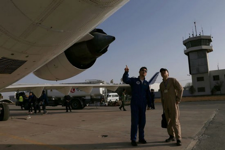 機務(wù)人員進行飛機狀態(tài)檢查。