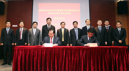 長(zhǎng)期以來(lái),國(guó)家外專局對(duì)中國(guó)商飛公司的人才引進(jìn)工作高度重視。2009年,雙方簽訂了《引進(jìn)國(guó)外智力服務(wù)框架協(xié)議》。2012年,雙方簽訂了《2012年引智工作行動(dòng)計(jì)劃》,國(guó)家外專局還授予中國(guó)商飛公司全國(guó)首家“國(guó)家引進(jìn)國(guó)外智力示范單位”稱號(hào)。