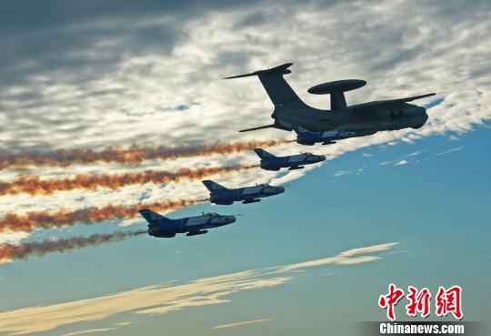 國產(chǎn)預(yù)警飛機經(jīng)過嚴格試飛定型后,裝備部隊并參與執(zhí)行新中國成立60周年大閱兵任務(wù)。圖為預(yù)警機和護衛(wèi)飛機進行飛行編隊訓(xùn)練!∽T超 攝