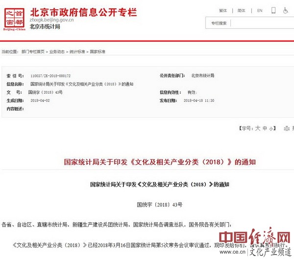 《文化及相關(guān)產(chǎn)業(yè)分類(2018)》已經(jīng)2018年3月16日國(guó)家統(tǒng)計(jì)局第5次常務(wù)會(huì)議審議通過(guò),現(xiàn)印發(fā)給你們,請(qǐng)認(rèn)真貫徹執(zhí)行。