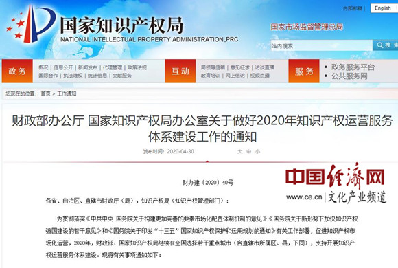 財(cái)政部辦公廳 國(guó)家知識(shí)產(chǎn)權(quán)局辦公室關(guān)于做好2020年知識(shí)產(chǎn)權(quán)運(yùn)營(yíng)服務(wù)體系建設(shè)工作的通知