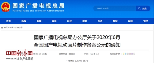 經(jīng)濟(jì)日?qǐng)?bào)-中國經(jīng)濟(jì)網(wǎng)北京8月5日訊 中國經(jīng)濟(jì)網(wǎng)文化產(chǎn)業(yè)頻道記者從國家廣播電視總局官網(wǎng)獲悉,《國家廣播電視總局辦公廳關(guān)于2020年6月全國國產(chǎn)電視動(dòng)畫片制作備案公示的通知》(簡稱《通知》)于4日發(fā)布?!锻ㄖ访鞔_,2020年6月,經(jīng)備案公示的全國國產(chǎn)電視動(dòng)畫片為53部,19934分鐘。