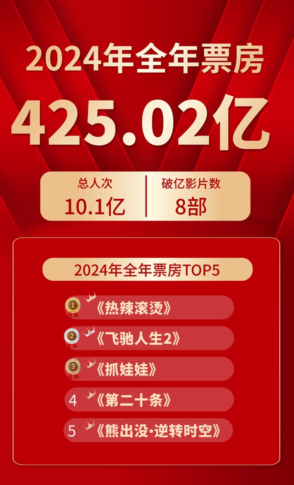 中國經(jīng)濟網(wǎng)北京1月2日訊 據(jù)國家電影局統(tǒng)計,2024年全年總票房425.02億,城市院線觀影總?cè)舜?0.1億。其中,國產(chǎn)影片票房為334.39億元,占比78.68%。