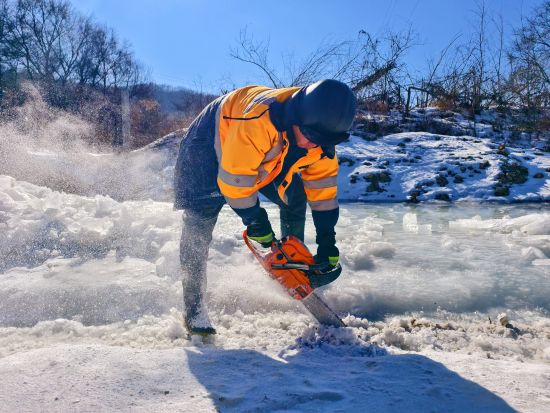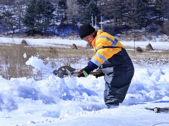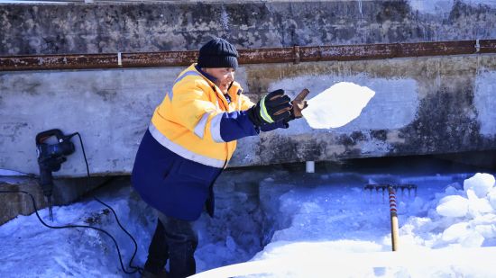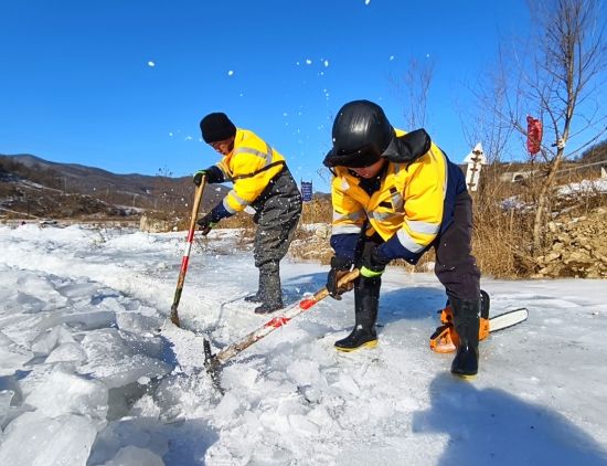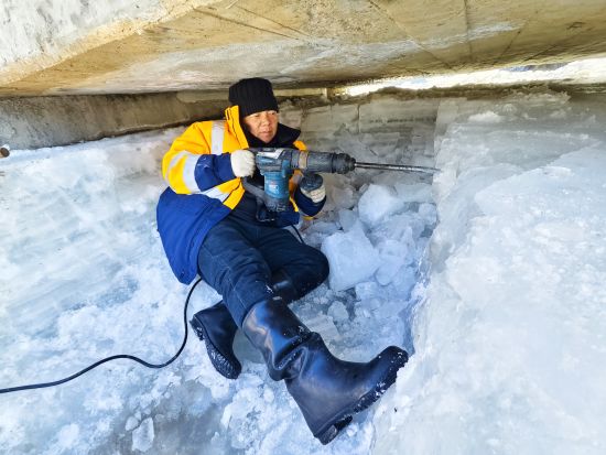 2月初的北方山區(qū),寒風(fēng)呼嘯,風(fēng)力達(dá)五級,氣溫逼近零下20攝氏度。職工們手持油鋸、電鎬破開冰層,由于橋下空間有限,職工們有時需要半跪或是半躺式,一層層的進(jìn)行破冰,然后再用鐵鍬將碎冰鏟至河道兩側(cè)。冰水混合物不斷濺到身上,迅速凝結(jié)成冰,不到半小時,許多人外套已覆上一層白霜,成了名副其實的“冰人”。然而無人停歇,破冰動作穩(wěn)健而持續(xù)。
