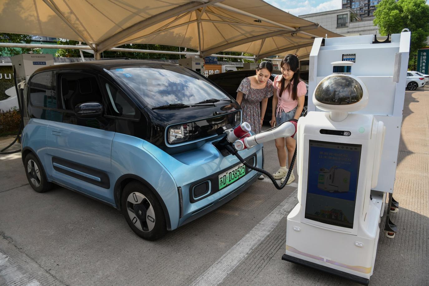 新能源車主在金華市金東區(qū)光南充電站體驗儲能式可移動智能機器人自助充電服務(wù)。(周寧/攝)