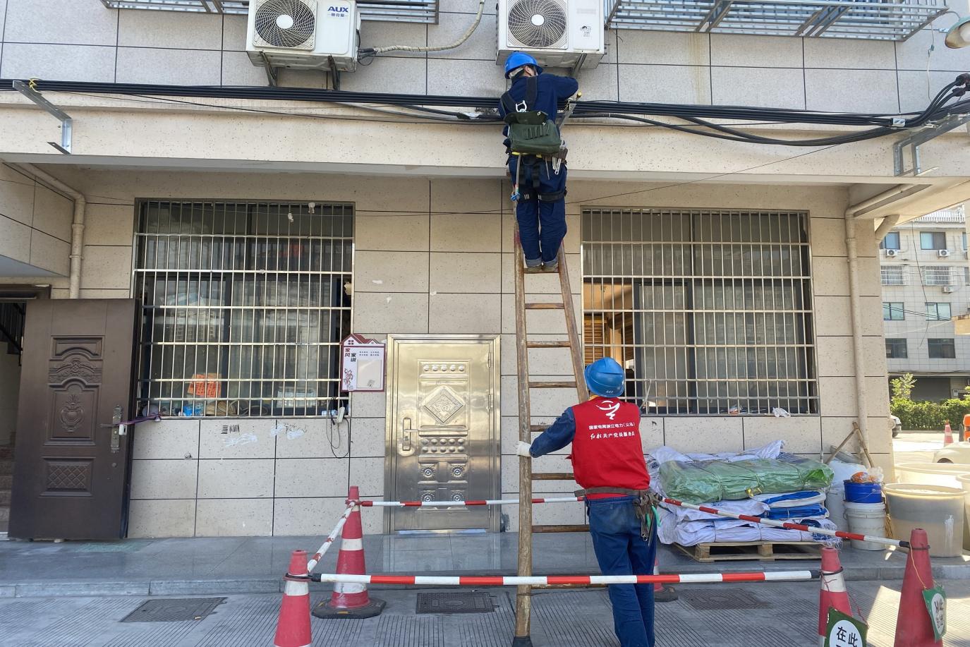 在義烏城西街道流大塘二區(qū),電力作業(yè)人員正在綁扎集束電纜。(陳紫涵/攝)