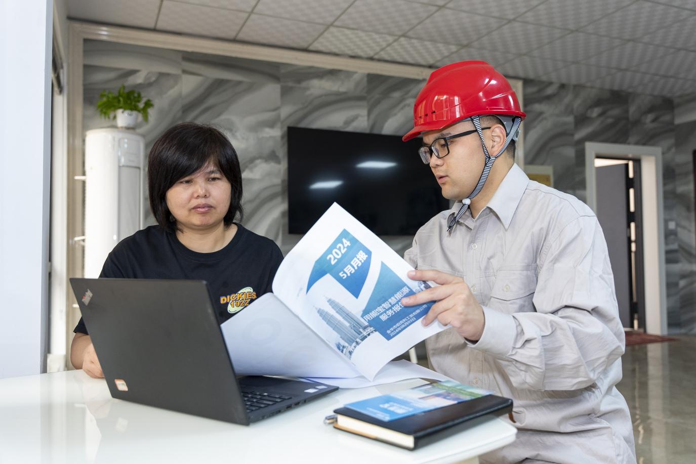 工作人員在金華市伯克利工貿(mào)有限公司為企業(yè)相關(guān)負責人分析5月份用能情況。(梅建微/攝)