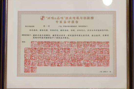 “清亮透明。窖香優(yōu)雅,陳香舒適。醇厚綿甜,協(xié)調(diào),回味悠長(zhǎng)。具有水井坊酒典型風(fēng)格?!薄盎匚?amp;品味”酒業(yè)傳承與創(chuàng)新榜專(zhuān)家鑒評(píng)報(bào)告也給予水井坊“第一坊”高度評(píng)價(jià)。