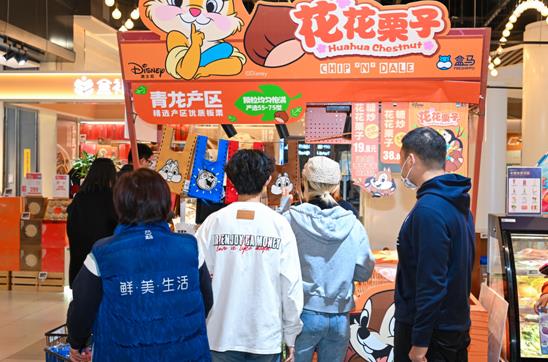 在哈一口氣便能凝結(jié)出霧的寒冬,暖呼呼的糖炒栗子最能溫暖人心。在午后的盒馬線(xiàn)下門(mén)店,糖炒栗子的檔口已經(jīng)排起了長(zhǎng)隊(duì),工作人員將剛炒制出來(lái)的新鮮栗子裝進(jìn)了印有迪士尼人物奇奇蒂蒂形象的紙盒里,遞給消費(fèi)者?!疤鹛鹋磁吹睦踝?,最適合當(dāng)冬天小零食”、“沖著這個(gè)包裝來(lái)買(mǎi)的,太可愛(ài)了?!?/p>