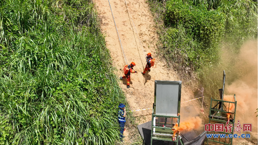 消防員在特殊地形處置煙點。特殊地形煙點處置是指在無法直接接近的陡坡設(shè)置模擬煙點(水袋),要求人員協(xié)同利用繩索技術(shù)安全抵近煙點進(jìn)行處置,以輸水時間和組織的安全性綜合評定成績,檢驗特殊地形條件下滅火、救援技術(shù)結(jié)合運用的能力。 李為展/攝