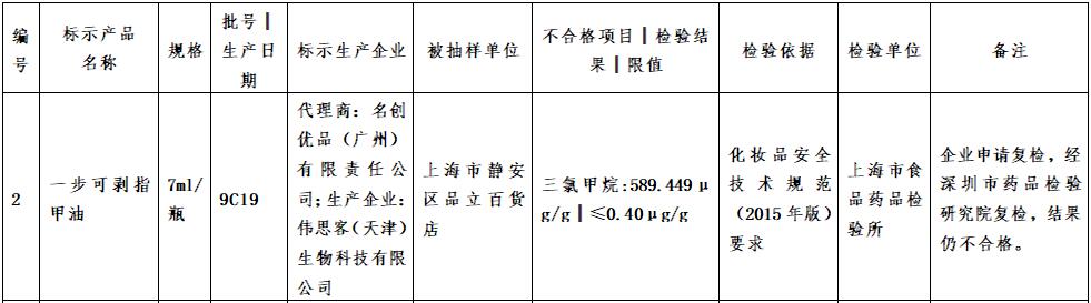 經(jīng)濟(jì)日報-中國經(jīng)濟(jì)網(wǎng)9月25日訊(記者 韓璐) 上海市藥品監(jiān)督管理局23日發(fā)布的抽檢公告顯示,由名創(chuàng)優(yōu)品(廣州)有限責(zé)任公司代理的指甲油添加禁用物質(zhì)三氯甲烷,并且經(jīng)企業(yè)申請復(fù)檢后結(jié)果仍不合格。 檢驗(yàn)結(jié)果顯示,該產(chǎn)品中三氯甲烷的含量高達(dá)589.449μg/g,相比《化妝品安全技術(shù)規(guī)范》(2015年版)中規(guī)定的檢測限值超標(biāo)1400多倍。