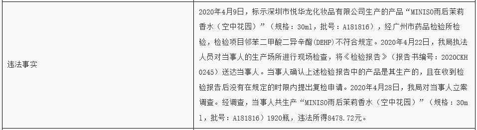 廣東省藥品監(jiān)督管理局官網(wǎng)公布的行政處罰決定書顯示,2020年4月9日,標(biāo)示深圳市悅?cè)A龍化妝品有限公司生產(chǎn)的產(chǎn)品“MINISO雨后茉莉香水(空中花園)”(規(guī)格:30ml,批號:A181816),經(jīng)廣州市藥品檢驗(yàn)所檢驗(yàn),檢驗(yàn)項(xiàng)目鄰苯二甲酸二異辛酯(DEHP)不符合規(guī)定。