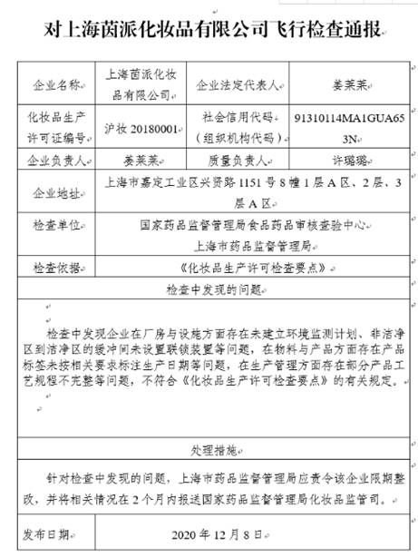 飛行檢查報告顯示,在檢查中發(fā)現(xiàn)上海茵派化妝品有限公司在廠房與設(shè)施方面存在未建立環(huán)境監(jiān)測計劃、非潔凈區(qū)到潔凈區(qū)的緩沖間未設(shè)置聯(lián)鎖裝置等問題,在物料與產(chǎn)品方面存在產(chǎn)品標(biāo)簽未按相關(guān)要求標(biāo)注生產(chǎn)日期等問題,在生產(chǎn)管理方面存在部分產(chǎn)品工藝規(guī)程不完整等問題。