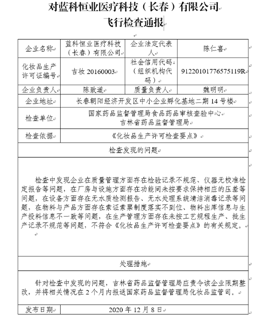 針對(duì)檢查中發(fā)現(xiàn)的問題,國(guó)家藥監(jiān)局要求吉林省藥品監(jiān)督管理局應(yīng)責(zé)令該企業(yè)限期整改,并將相關(guān)情況在2個(gè)月內(nèi)報(bào)送國(guó)家藥品監(jiān)督管理局化妝品監(jiān)管司。