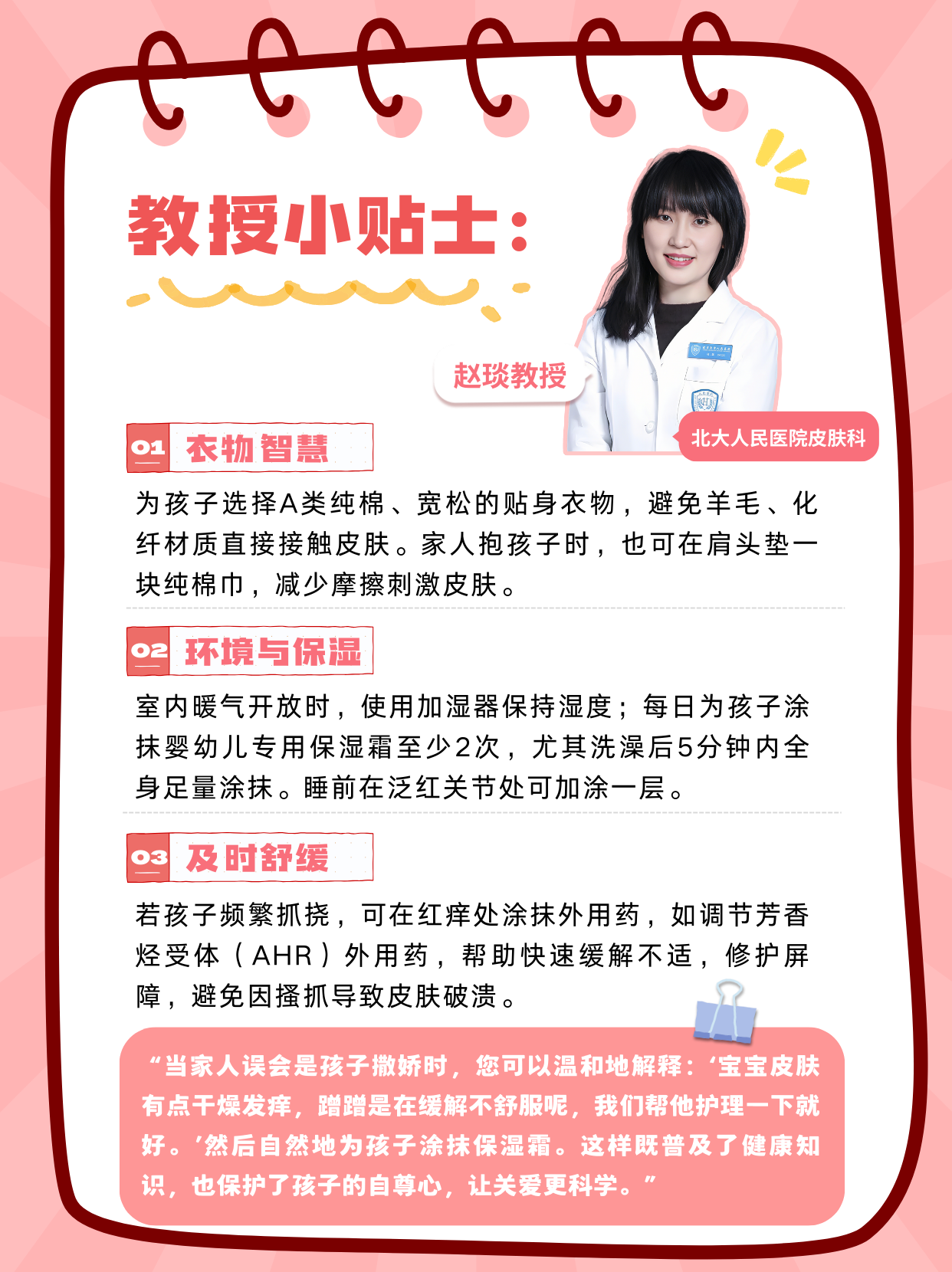 “嬰幼兒特應(yīng)性皮炎(AD)在冬季高發(fā),孩子無法清晰表達(dá)‘癢’,只能通過蹭、抓等動(dòng)作緩解不適,家人常誤認(rèn)為是親昵或調(diào)皮。春節(jié)期間環(huán)境變化易誘發(fā)病情加重,家長無需過度焦慮,記住三點(diǎn)科學(xué)護(hù)理,孩子就能舒適過年: