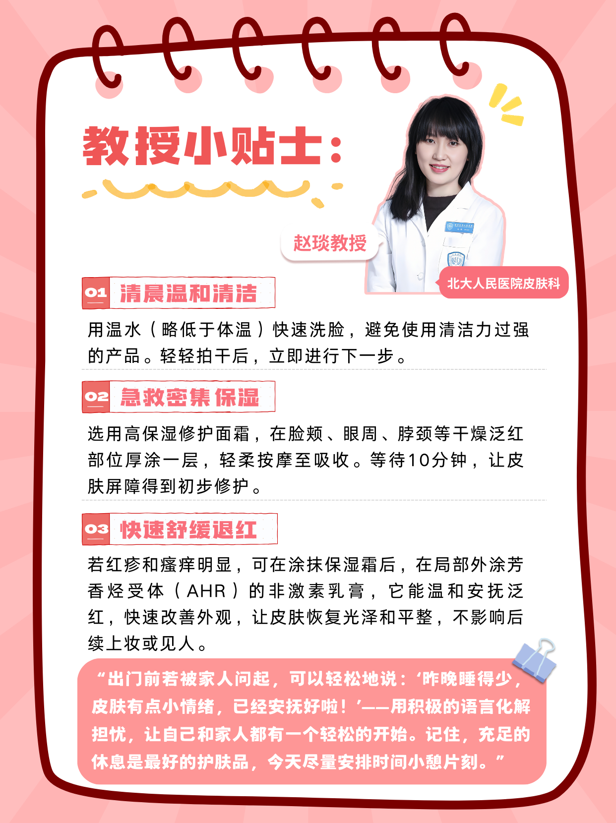 “出門前若被家人問起,可以輕松地說:‘昨晚睡得少,皮膚有點(diǎn)小情緒,已經(jīng)安撫好啦!’——用積極的語言化解擔(dān)憂,讓自己和家人都有一個(gè)輕松的開始。記住,充足的休息是最好的護(hù)膚品,今天盡量安排時(shí)間小憩片刻?!?/p>