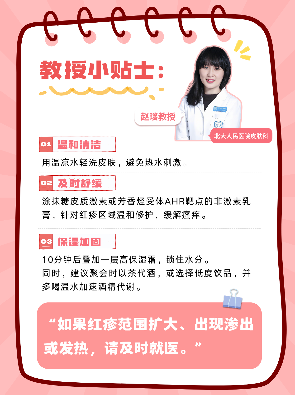 “酒精會(huì)擴(kuò)張血管、加劇皮膚炎癥,特皮患者尤其需節(jié)制。若已出現(xiàn)紅疹干癢,請按以下步驟處理: