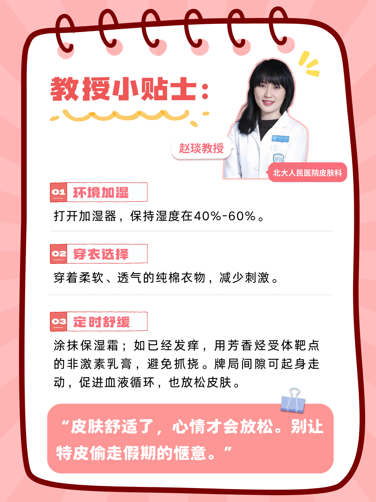 “冬季室內(nèi)長時(shí)間供暖,濕度往往低于40%,這種‘人工沙漠’環(huán)境會(huì)迅速奪走皮膚水分,破壞屏障。久坐時(shí),皮膚與衣物、座椅持續(xù)摩擦產(chǎn)生微小刺激,加上精神集中于牌局容易忽視早期不適,常導(dǎo)致特應(yīng)性皮炎(AD)悄然加重。別讓皮膚問題‘胡牌’,記住這三招破解: