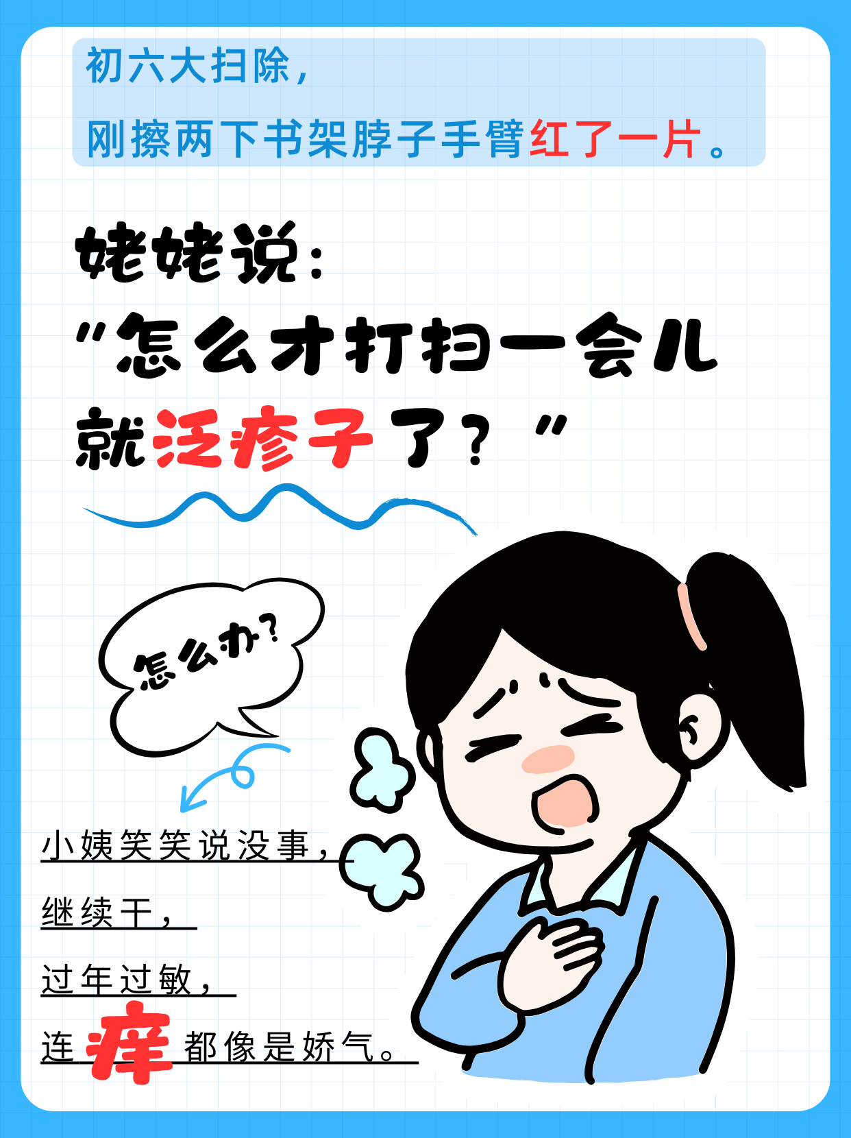 初六大掃除,剛擦兩下書架脖子手臂紅了一片。