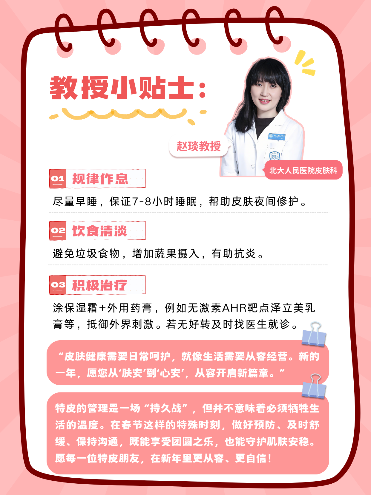 特皮的管理是一場“持久戰(zhàn)”,但并不意味著必須犧牲生活的溫度。在春節(jié)這樣的特殊時(shí)刻,做好預(yù)防、及時(shí)舒緩、保持溝通,既能享受團(tuán)圓之樂,也能守護(hù)肌膚安穩(wěn)。愿每一位特皮朋友,在新年里更從容、更自信!