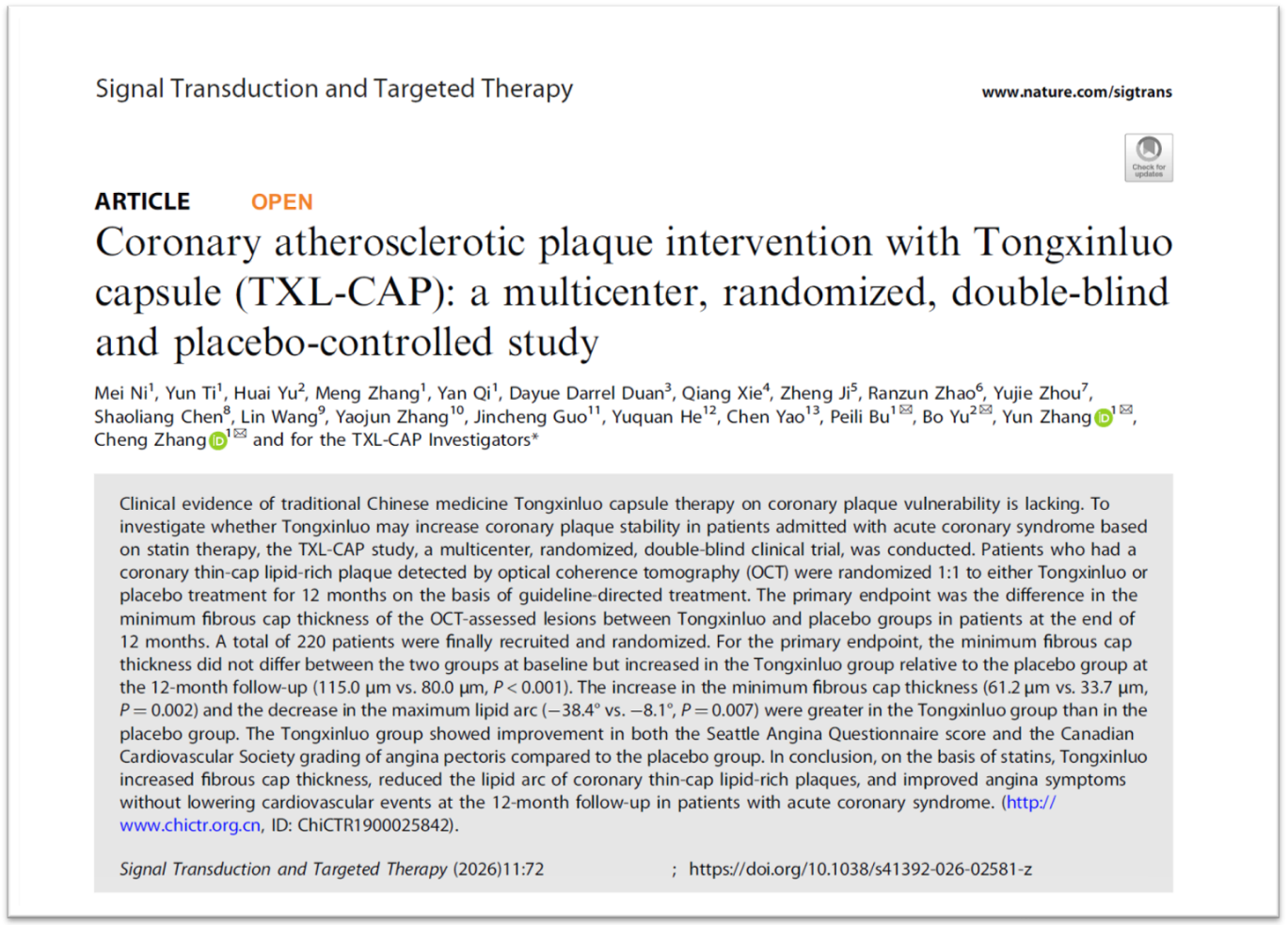 2月24日,“通心絡膠囊干預急性冠脈綜合征冠狀動脈粥樣硬化斑塊的隨機、雙盲、安慰劑平行對照、多中心臨床研究(TXL-CAP多中心研究)”論文在施普林格?自然集團(Springer Nature)主管的國際權威學術期刊《信號轉導與靶向治療》(Signal Transduction and Targeted Therapy,簡稱STTT,影響因子52.7)在線發(fā)表。結果顯示,在他汀等現(xiàn)代標準治療基礎上聯(lián)合使用通心絡,可顯著增加急性冠狀動脈綜合征患者冠狀動脈易損斑塊纖維帽厚度,減小斑塊脂質弧度,并改善心絞痛癥狀,為臨床穩(wěn)定冠狀動脈斑塊提供了有效的治療手段。