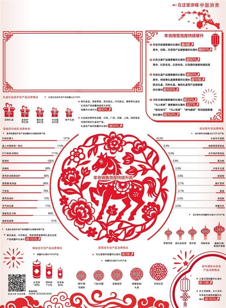 超市里琳瑯滿目的堅果禮盒、糕點禮盒,線上平臺爆火的“哭哭馬”生肖掛飾,長輩為孩子精心準(zhǔn)備的紅色年衣……臘八過后,年貨市場迎來消費高峰。數(shù)據(jù)顯示,紅色服飾、馬元素擺件、福字裝飾及各類禮盒類產(chǎn)品備受消費者青睞,成為年貨消費的熱門選擇。