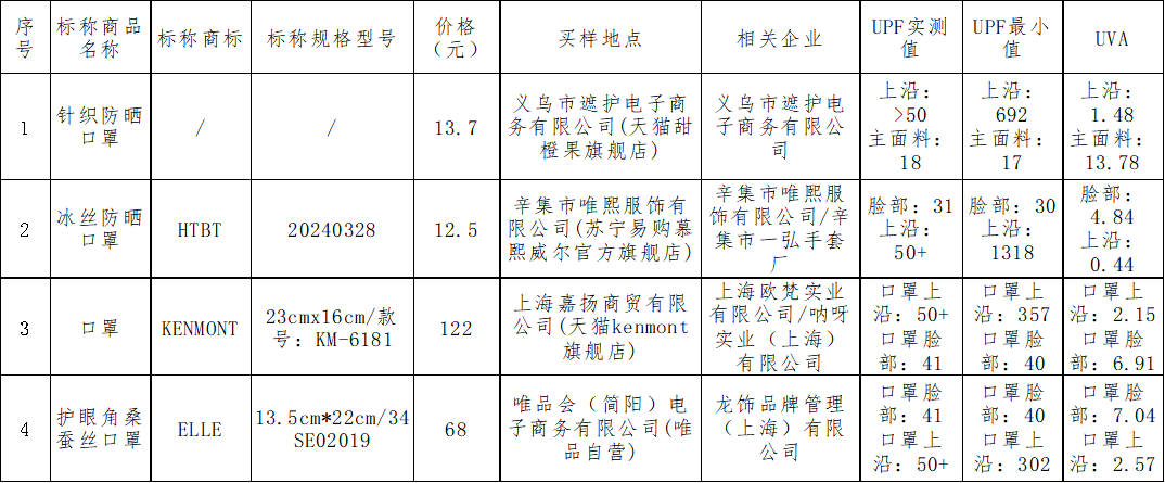 檢測(cè)發(fā)現(xiàn),45款樣品中,4款樣品不符合標(biāo)準(zhǔn)要求,例如標(biāo)稱(chēng)由義烏市遮護(hù)電子商務(wù)有限公司生產(chǎn)銷(xiāo)售的針織防曬口罩,其實(shí)測(cè)UPF值僅18(主面料),T(UVA)AV值高達(dá)13.78(主面料);其余41款樣品UPF>40并且T(UVA)AV<5%,防曬性能良好。