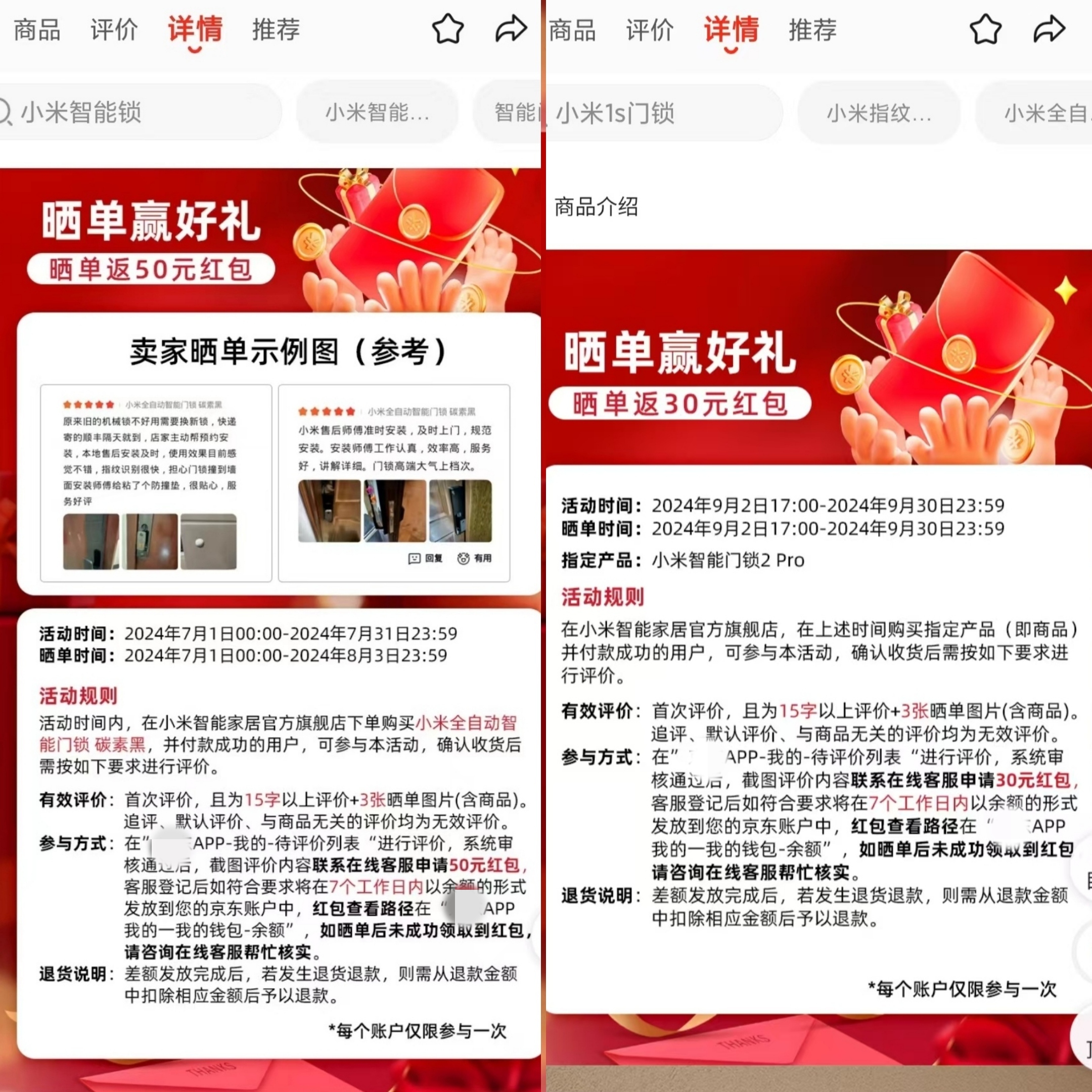 中國消費(fèi)者報北京訊(記者杜科)小米智能家居官方旗艦店在商品頁面宣稱“曬單返50元紅包”,且商家給出的曬單示例圖全是五星好評,消費(fèi)者認(rèn)為該活動涉嫌誘導(dǎo)用戶“好評返現(xiàn)”(詳見《中國消費(fèi)者報》7月30日1版《“好評返現(xiàn)”披上新外衣! 涉及小米、松下等品牌 法律人士:加強(qiáng)監(jiān)督管理 劍指不正當(dāng)競爭》)。報道刊發(fā)后引發(fā)社會廣泛關(guān)注。近日,記者再次調(diào)查了報道中涉及的相關(guān)網(wǎng)店和商品,發(fā)現(xiàn)其均已做了調(diào)整。