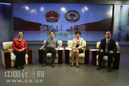 第十一屆全國(guó)人大代表、山東臨沭縣農(nóng)業(yè)局農(nóng)經(jīng)中心主任劉建文,農(nóng)業(yè)部全國(guó)農(nóng)業(yè)技術(shù)推廣服務(wù)中心土肥處處長(zhǎng)李榮,國(guó)家緩控釋肥工程技術(shù)研究中心副主任、山東金正大公司副總經(jīng)理陳宏坤做客中國(guó)經(jīng)濟(jì)網(wǎng)。(王耀峰 攝)