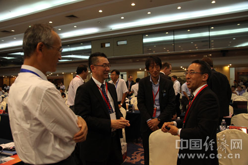 由中國(guó)道路交通安全協(xié)會(huì)、中國(guó)汽車技術(shù)研究中心和中國(guó)經(jīng)濟(jì)網(wǎng)共同主辦的“2013中國(guó)道路交通安全論壇”于8月29日在北京首都大酒店舉行。圖為日產(chǎn)汽車株式會(huì)社企劃·先行技術(shù)開發(fā)本部部長(zhǎng)高橋信彥(右)與參會(huì)嘉賓進(jìn)行交流。中國(guó)經(jīng)濟(jì)網(wǎng) 裴小閣 攝影