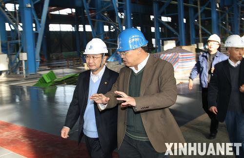 在一重新建成的重型加工熱處理車間,吳生富(戴藍帽者)向來訪的中廣核工程公司總經(jīng)理束國剛一行介紹一重在制核電產品情況(2009年10月28日攝)。新華社發(fā)(陳建軍攝)