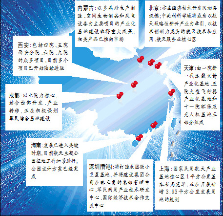 上海國家民用航天產(chǎn)業(yè)基地核心區(qū)1平方公里基本布局完畢,并正在開展新增3.93平方公里發(fā)展用地的概念性規(guī)劃和控制性詳細(xì)規(guī)劃。西安國家民用航天產(chǎn)業(yè)基地包括四院、五院西安分院、六院、九院的眾多項目,目前多個項目已開始陸續(xù)進(jìn)駐。在四川成都,以七院為核心,結(jié)合西部開發(fā)、產(chǎn)業(yè)轉(zhuǎn)移,正在積極謀劃軍民結(jié)合基地建設(shè)。在中國北疆的內(nèi)蒙古,集團(tuán)公司以多晶硅生產(chǎn)制造、空間生物制品和風(fēng)電設(shè)備為主要項目的產(chǎn)業(yè)化基地建設(shè)取得重大成果,相關(guān)產(chǎn)品已推向市場,取得了較好的經(jīng)濟(jì)效益。